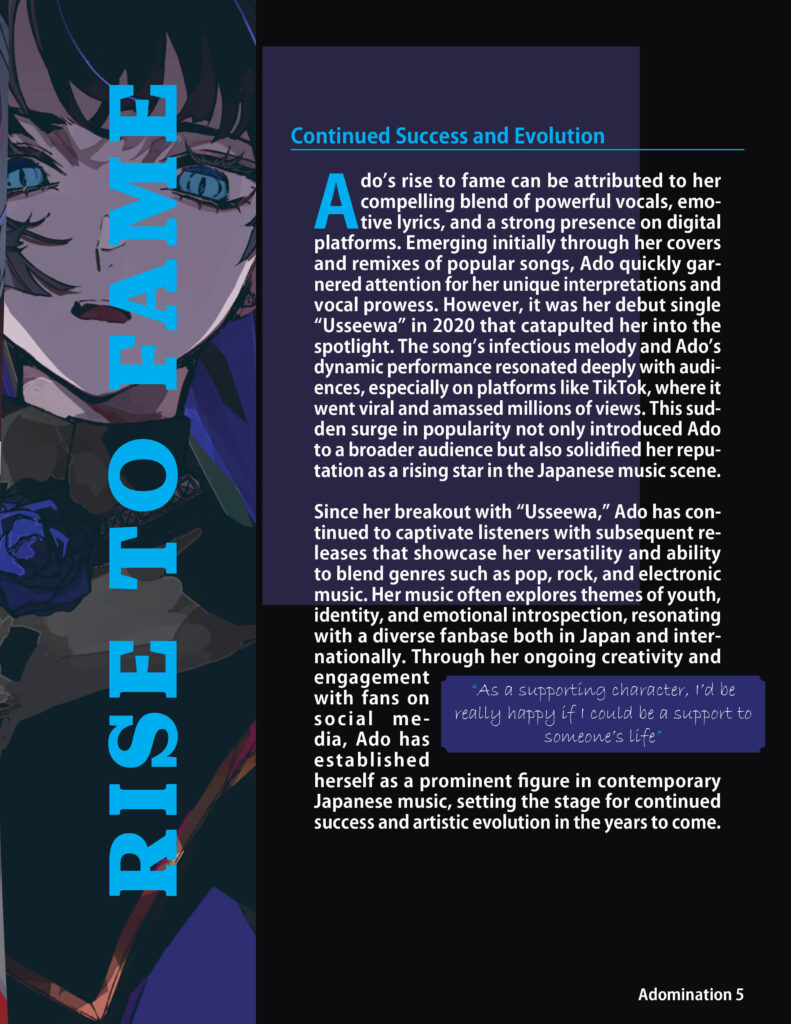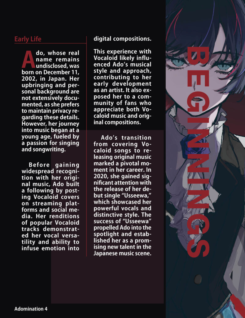 A stylish magazine Covers/Pages made in InDesign about the rising Japanese star Ado.